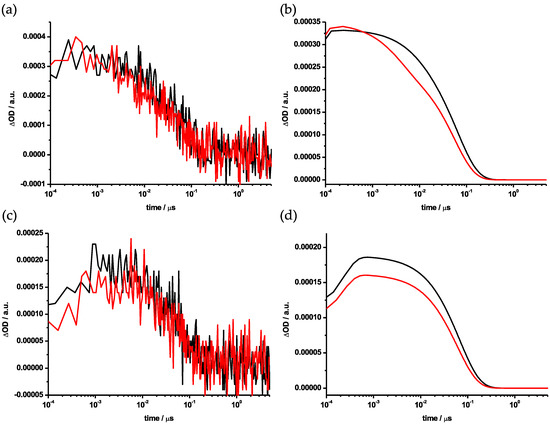 Transient Absorption Spectroscopy: The excitation was performed with an amplified CPA-2110 titanium:sapphire laser (1 kHz; 150 fs pulse width; 400 nJ laser energy) from Clark-MXR Inc. EOS SYSTEM (0–10 μs) from Ultrafast Systems, working with 1 kHz pump laser at 387 nm wavelength. Probing was performed with a 2 kHz continuous white light fiber laser. Data evaluation has been conducted by means of multiwavelength and global analysis using the GloTarAn package [52].