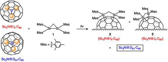 - Kako, M.; Sugiura, T.; Akasaka, T. Photochemical addition of silirane to endohedral metallofullerene: Electronic properties of carbosilylated Sc3N@Ih-C80. Phosphorus Sulfur Silicon Relat. Elem. 2016, 191, 201–206. [Google Scholar] [CrossRef]