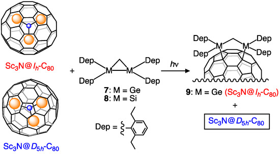 - Kako, M.; Nagase, S.; Akasaka, T. Functionalization of Endohedral Metallofullerenes with Reactive Silicon and Germanium Compounds. Molecules 2017, 22, 1179. [Google Scholar] [CrossRef] [Green Version]