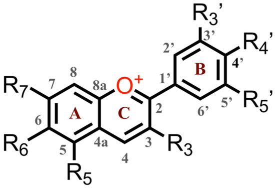 Natural anthocyanins. The seven substituents vary between -H, -OH, -OCH3, and -O-carbohydrate.