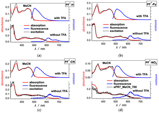 Optical absorption, fluorescence and excitation spectra of (a) PF+-H and (b–d) PF+-X dyes with electron-deficient ring E (Scheme 1), 10 μM in acetonitrile (MeCN) in the presence and absence of 10 mM trifluoroacetic acid (TFA). (For the emission spectra: λex = 460 nm; for the excitation spectra of PF+-H, PF+-Py and PF+-CN: with TFA, λem = 520 nm, and without TFA, λem = 615 nm; and for the excitation spectra of PF+-NO2: with TFA, λem = 615 nm, and without TFA, λem = 700 nm.)