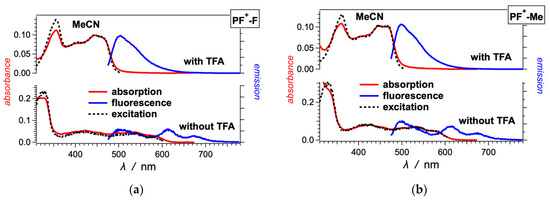 Photophysical properties of the PF+-X derivatives (Chart 1) for acetonitrile as a solvation medium in the presence and absence of trifluoroacetic acid (TFA).