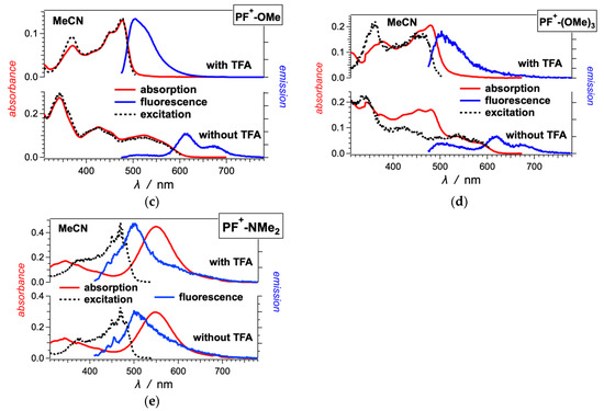 Optical absorption, fluorescence and excitation spectra of (a) PF+-F, (b) PF+-Me and (c–e) other PF+-X dyes with electron-donating groups on ring E (Scheme 1), 10 μM in MeCN in the presence and absence of 10 mM TFA. (For the emission spectra: λex = 460 nm; for the excitation spectra of the dyes: with TFA, λem = 520 nm, and without TFA, λem = 615 nm.)