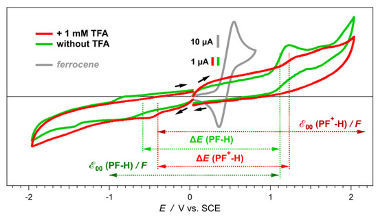 Effects of added trifluoroacetic acid, TFA (1 mM), on the cyclic voltammograms of PF+-H in MeCN in the presence of 50 mM (n-C4H9)4NPF6, v = 50 mV s−1. The dye concentration was kept at 100 μM. Cyclic voltammograms of ferrocene (1 mM) in MeCN in the presence of 100 mM (n-C4H9)4NBF4, v = 50 mV s−1 (under these conditions, EFc+|Fc(1/2) = 0.45 V vs. SCE [38]), are recorded before and after each series of electrochemical measurements of the dyes to check for any potential drifts of the SCE reference electrode while immersed in the organic electrolyte solution.