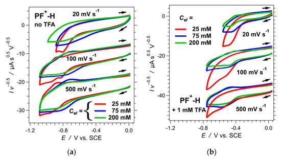 Dependence of the cyclic voltammograms of PF+-H on the scan rate, v, and the concentration of (n-C4H9)4NPF6 as the supporting electrolyte, Cel, in acetonitrile. Each voltammogram is normalized by the square root of the scan rate. (a) Cyclic voltammograms of PF+-H with no TFA added. (b) Cyclic voltammograms of PF+-H in the presence of 1 mM TFA.
