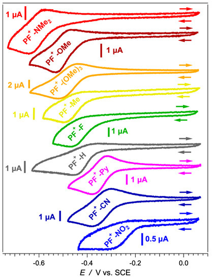 Voltage scans between 0 and −0.7 V vs. SCE induces one-electron reduction of the acid forms of the dyes, i.e., PF+-X + e− → PF⦁-X. The cyclic voltammograms of most PF+-X derivatives in the presence of TFA reveal partially reversible reduction (Figure 5), indicative of relatively stable radicals, PF⦁-X. The reduction potentials, , of the PF+-X conjugates range between about −0.6 and −0.2 V vs. SCE (Table 2) placing them on par with some of the most electron-deficient organic compounds used as electron acceptors, such as quinones, perylenediimides and nitroaromatics [55,71,72,73,74,75,76,77,78]. The values of their excitation energies, 00, make the acidic forms of the PF+-X dyes quite potent photooxidants. Most of the photoexcited dyes are thus able to extract electrons from weak electron donors with reduction potentials of their oxidized forms of up to about 2 V vs. SCE (Table 2), which is near the upper limit of the redox window of many solvents of practical importance. Electron acceptors capable of oxidizing species outside the solvent redox window are, of course, to be avoided due to their propensity to induce undesired side reactions involving the solvating medium itself. The photoexcited PF+-X dyes are also capable of injecting holes in a wide range of p-type semiconductors with valence bands (VBs) above −6 eV vs. the vacuum level (Table 2), such as NiO [79].