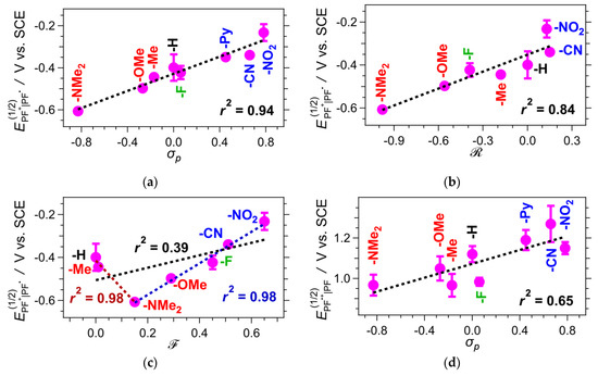 Correlations of the reduction half-wave potentials, E(1/2), of protonated PF+-X dyes (for MeCN in the presence of 50 mM Scheme 1. mM TFA, Table 2) with: (a) the Hammett para-substituent constant, σp, of the substituent, -X, on ring E (for -Py, the reported σm of pyridine [86] was employed); (b) the Swain–Lupton resonance parameter, , of -X, accounting for the mesomeric effects via π-conjugation with the aromatic ring; and (c) the Swain–Lupton field parameter, , of -X, accounting for the inductive effect. (d) Correlations of the reduction half-wave potentials, E(1/2), of the oxidized forms of the deprotonated dyes, PF⦁+-X (with no TFA added, Table 2) with the Hammett para-substituent constant, σp, of the substituent, -X, on ring E. The values of E(1/2) were extracted from the average potentials of the anodic and the cathodic peaks of the cyclic voltammograms showing reversible or partially reversible behavior. For the samples exhibiting irreversible reduction, the values of E(1/2) were obtained from the inflection point of the cathodic waves [40,84,85]. The dashed lines show the linear correlations, and the corresponding correlation coefficients, r2, are listed. For (c), in addition to the linear correlation for all samples (in black), the correlation for (-X) ≤ (-NMe2) is in red, the correlation for (-X) ≥ (-NMe2) is in blue.