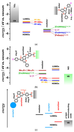 The ability to vary the electronic properties of these dyes by changing the electron density of ring E offers a range of opportunities to optimize rates of electron and hole injection in the semiconductors of n- and p-DSSCs at as small diving forces as possible. Employing linker-photosensitizer-donor and linker-photosensitizer-acceptor dye designs suppresses undesired charge recombination. The choice of mediators for shuttling charges between the electrodes is also crucial for optimizing the performance of such devices [93,94,95,96,97,98]. Therefore, dyes with broadly tunable optical and electrochemical properties, such as PF+-X (Scheme 1), are important for advancing the field.