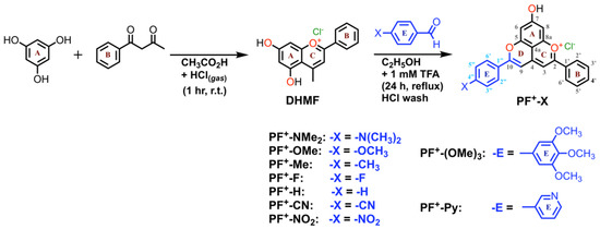 Synthesis of pyranoflavylium dyes, PF+-X.