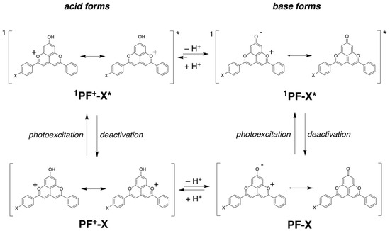 The absence of TFA results in a distinct 100-nm bathochromic shift and a decrease in 00 to about 2 eV (Figure 1 and Figure 2, Table 1). This shift is consistent with the appearance of the weakly fluorescent base form of the dyes. The absorption spectra in the absence of TFA show contributions from both the acid and base forms of the dyes. The emission spectra of most dyes, on the other hand, show only the long-wavelength fluorescence originating from the base forms of the excited-state dyes (Figure 1 and Figure 2). These observations are considered with the increase in the acidity of the hydroxyl at position 7 upon photoexcitation [59]. While in their ground states, the PF+-X dyes exist as mixtures of their acid and base forms, in the excited state, they readily deprotonate and exist predominantly as the excited-state base forms of the dyes.