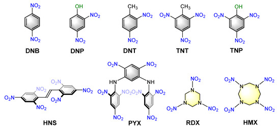 Chemical structures of various nitroaromatic and nitramine explosives considered in this review article.