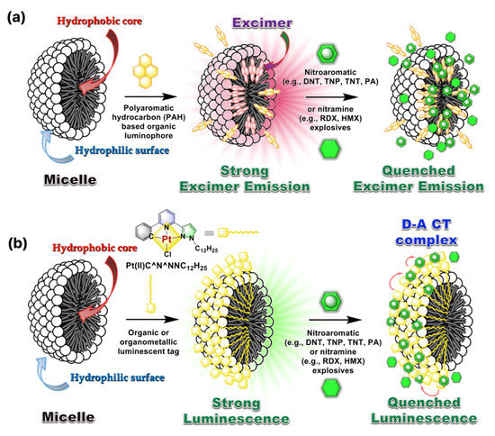 The proposed mechanism involved in the “Turn OFF” luminescent sensing of explosive analytes. (a) Luminescence quenching of excimer-based emission in the presence of explosive analytes. (b) Luminescence quenching of a surface-modified micellar system by supramolecular D–A CT transition within the cyclometallated luminophore (D) and explosive analytes (A). The models are redrawn based on the concept used in references [22,23].