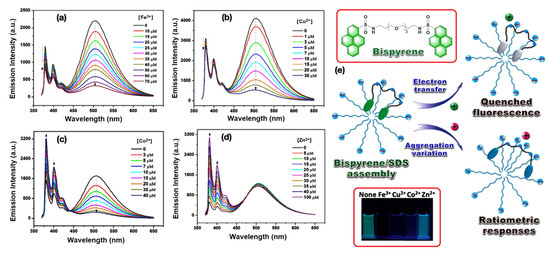Taking advantage of the aggregated pyrene-based excimer emission, Ding and co-workers used a series of synthetic luminescent molecular probes for constructing the surfactant ensembled metal ion sensors, which are nicely summarized in a recent article [12]. Among the series, the neutral bispyrene derivative shown in Figure 3 inset provides substantial sensing behavior to various di- and tri-valent metal ions. Interestingly, when the bispyrene/SDS assemblies are titrated against Fe3+, Cu2+, Hg2+, emission quenching was observed (cf. Figure 3a,b in case of Fe3+, Cu2+ respectively), however, incremental addition of Mg2+, Ca2+, Co2+, Ni2+, Zn2+, Cd2+, and Pb2+ exhibit ratiometric response (cf. Figure 3c,d in case of Co2+ and Zn2+ as representative examples). A prominent optical change in the presence of these metal ions under exposure of UV light reflects their potential applications in metal ion sensing. The suggested mechanism involving the sensing behavior of bispyrene/SDS adduct against these di- and tri-valent metal ions by emission quenching and ratiometric pathway is shown in Figure 3e. The flexibility of the long aliphatic bridge of bispyrene derivative plays an important role during the sensing process.