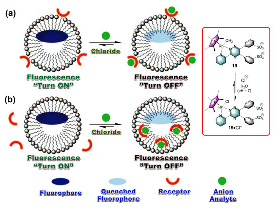 To demonstrate Cl− sensing by metal complexes, the work of Severin and coworkers is noteworthy [15]. Their aqueous buffered solution was loaded with a Rh(II)-complex (19) as a coordinating site and hydroxypyrenesulfonate as fluorophore, which is mixed with a supplementary surfactant. The resulting adduct remarkably increases Cl− affinity. It was described that Cl− binds to the metal center, which in turn changes the phase behavior of the whole system. The metal complex now in turn becomes amphiphilic in nature as compared to its initial ionic state, which can easily move towards the lyophilic core of the micelle. The resulting species causes significant modulation of the luminescence property. A fluorescence quenching was observed, which is directly related to the added Cl− concentration (Figure 4a,b). This in situ generated anion sensor showcased a model system which exhibits high sensitivity and selectivity, by signal transduction mechanism, which can effectively work in a neutral aqueous solution (i.e., at pH = 7).