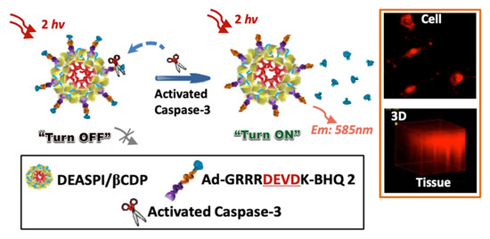 Pioneering work by Li and Yang et al. on poly β-Cyclodextrin/TPdye nanomicelle-based two-photon nanoprobe is reported describing two-photon-induced fluorescent microscopic detection of enzymatic activities in living cells and tissues [63]. In this nanoprobe, a two-photon active (TPA) donor molecule trans-4-[p-(N,N-diethylamino)styryl]-N-methylpyridinium iodide (DEASPI) was used as a complementary combination with β-CDP nanomicelle. This combined adduct serves as a potential TPA fluorophore and also behaves like a carrier vehicle to deliver a specific peptide sequence to the living cell through fast endocytosis. For example, an adamantine GRRRDEVDK-BHQ2 peptide (Ad-DEVD-BHQ2) can be easily mounted to construct a robust inclusion complex, DEASPI/βCDP@Ad-DEVD-BHQ2 onto the nanomicellar surface by various noncovalent interactions (cf. Figure 7). The adduct DEASPI/βCDP@Ad-DEVD-BHQ2 was then used to demonstrate both in vitro and in vivo enzymatic activities assay of caspase-3 in the complex biological environment. From their experiments, it is evident that this “Turn-ON” fluorescent biosensor offers a new platform for high-contrast imaging of enzymatic activities within live cells and tissues. (Figure 7, Inset) Thus, DEASPI/βCDP@Ad-DEVD-BHQ2 nanoconjugate also offers the opportunity to screen enzyme inhibitors, which are also able to evaluate the apoptosis-associated disease progression.