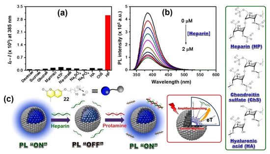 Recently Lee et al. reported an interesting model sensor [17] to sense heparin (HP) with amplified fluorescence response resulted from inter-fluorophore excitation migration within a self-assembled micellar medium. For this purpose, a coumarin-based amphiphilic fluorescent molecule (see Figure 8, Inset) is designed which forms a micellar structure consisting of a hydrophobic core and hydrophilic surface, where the aggregated coumarins promote the energy and electron transport under bioanalytical conditions. The sensing response of micellized 22 (5.0 × 10−6 M) via ionic (cationic–anionic) interactions is also highly selective for HP among the other tested analytes e.g., dextrose, sucrose, glucose, mannitol, ATP, sodium citrate, Na2SO4, Na3PO4, sodium hyaluronate (HA), and chondroitin sulfate sodium salt (ChS) in a 10-mM HEPES buffer solution at pH 7.4 at ambient condition (Figure 8a). High selectivity of the micellized 22 (5.0 × 10−6 M) for HP via fluorescence suppression, reaches a quenching maximum of ~78.4% with an incubation of HP of concentration 2.0 × 10−6 M (Figure 8b). The sensing mechanism for the detection of heparin by the conjugated micellar system of coumarin derivative 22 is shown in Figure 8c.