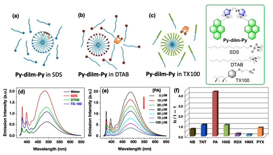 Another interesting example of a dimeric pyrene-based luminophoric system (Py-diIm-Py) was reported by Ding et al. demonstrating explosive sensing [22] by the quenching of excimer emission. This dicationic luminophore effectively encapsulated the surface of the anionic sodium dodecyl sulfate (SDS) micelle as a result of electrostatic interactions from a highly luminescent micellar probe. However, in cationic dodecyl trimethyl ammonium bromide (DTAB) or in neutral Triton X-100 (TX100) micellar medium, py-diIm-Py mostly dispersed in solvent without significant interactions with surfactants. Such variation of the fluorophore location in the micellar medium drastically influences the sensing property of the adduct to the analytes. As noted by the authors, this system effectively sense explosives by means of presumed quenching of excimer emission with a favorable geometrical and electronic (D–A) complementarity with analytes. The results shown in Figure 10 revealed that the electron poor NACs are sandwiched by two pyrene moieties that results in the disintegration of excimers.