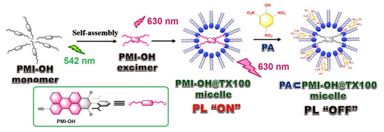 A perylene monoamide-based fluorescent micellar probe (PMI-OH) was reported [27] by Zhou and Yu et al. The ability of this system to detect PA was investigated in a solution phase using UV–vis and emission spectroscopic techniques. The PMI-OH sensor (cf. Figure 11, Inset) exhibits enhanced excimer emission at λmax at 630 nm with a nonionic surfactant Triton X-100 (TX100) which significantly quenched upon incremental addition of PA as a result of electron transfer (ET) from the PMI-OH donor to the PA acceptor.