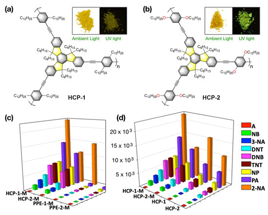(a,b) The chemical structures of truxene-based polymeric luminophores HCP-1 and HCP-2. Inset: The photographs of HCP-1 and HCP-2 under ambient light and upon irradiation provided by a UV lamp. (c,d) Fluorescence quenching efficiencies of HCPs-M and PPEs-M for different analytes (left) and fluorescence quenching efficiencies of HCP-1, HCP-2, HCP-1-M, and HCP-2-M respectively, for different analytes (right). The z-axis denotes the Stern–Volmer constant KSV. This figure is reproduced with permission from reference [75], Copyright © 2022, American Chemical Society.