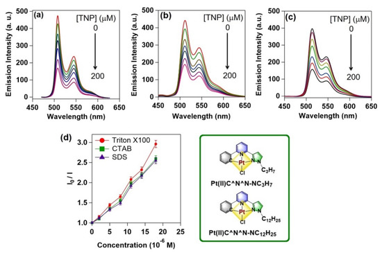 In addition to these fully organic classic luminophoric systems, cyclometallated metal complexes can be used as an alternate source to construct potential luminophoric adducts. For example, few of the current authors reported [23] an interesting luminophoric micellar adduct for sensing the nitroaromatic explosives in a solution phase, vapor phase, as well as a solid-state paper strip at ambient condition by using the cyclometalated Pt(II)C^N^N-based luminophoric units. As the hydrophobic alkyl chains (C12H25) are immersed into the lyophilic micelle core, the PtC^N^N head-groups might have been positioned on the surface of micelles to create a highly luminophoric platform which can effectively detect these explosives in an aqueous medium by quenching the Pt(II)C^N^N-based intense luminescence. It was speculated that the quenching mechanism involves an intermolecular supramolecular charge transfer (CT) transition originating from Pt(II)C^N^N-antenna moiety to the electron deficient explosives (cf. Figure 2b). Photoluminescence titrations of various Pt(II)C^N^N/micellar adducts (e.g., Pt(II)C^N^N-NC12H25/Triton X-100, Pt(II)C^N^N-NC12H25/SDS, and Pt(II)C^N^N-NC12H25/CTAB) against incremental addition of TNP (upto 200 μM) as shown in Figure 14 a–c, indicate significant luminescence quenching phenomena as the result of excited state photo-induced electron transfer (PET) process. Lifetime measurements were performed to understand the effect of nitroaromatic analytes on excited state behavior of Pt(II)C^N^N-NC12H25/micellar adduct. Moderate reduction of lifetime values from 49 ns to 35 ns (in presence of 2 equiv of TNT) and 31 ns (in presence of 2 equiv of TNP) were seen which support the luminescence quenching by PET from Pt(II)C^N^N-NC12H25/micelle donor to the electron poor explosive acceptors.