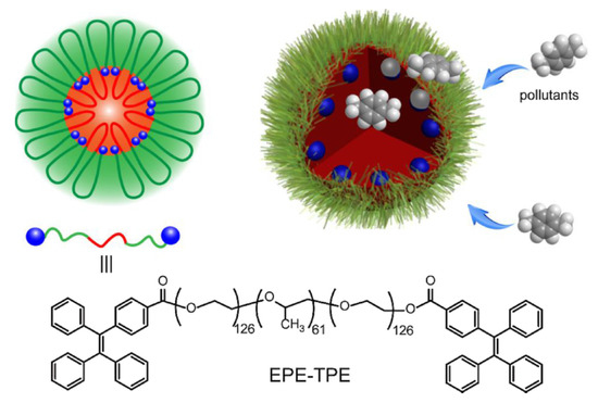 Aggregation-induced emission is a distinctive photophysical phenomenon where structurally flexible weak luminescent probes exhibit strong emission upon aggregation due to the induced vibrational rigidity [82]. The most common strategy to realize AIE is to add a nonsolvent in the solution of such molecules to stimulate aggregation by decreasing the solubility or making solid state material of such molecules through polymerization. Micellar structures with AIE active molecules also result in strong emission through aggregation of the monomer units in the micellar core and are the potential candidates for detection of explosive traces in the aqueous phase. Moreover, extraction of hydrophobic explosives from aqueous phase to the micellar core is an added advantage. The most widely used AIE compound used in present days is tetraphenylethylene (TPE). Liang et al. successfully anchored TPE to an amphiphilic triblock polymer, which self-assembled to form micellar structures in an aqueous medium (cf. Figure 15) [83]. As described, the hydrophobic TPE chromophore of the block polymer is self-organized in the micellar core-shell interface region, resulting in significant aggregation. Consequently, around 60-fold luminescence enhancement was noticed. The hydrophobic aromatic pollutants (e.g., benzene, toluene, xylene, ehtylbenzene, etc.) present in the aqueous medium can be efficiently extracted to the micellar core. This causes swelling of micelles as evidenced by their increased hydrodynamic diameter. However, the swelling process reduces aggregation among TPE chromophores, that exhibit quenched fluorescence intensity. The process is ultrafast and a nice concentration dependent fluorescence quenching phenomenon was observed with ultralow detection limit of 1 μg/L.
