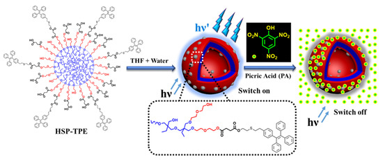 A very similar TPE-based amphiphilic molecule was synthesized by Nabeel et al., where arboxyl functionalized hyperbranched polymer, poly(3-ethyl-3-oxetanemethanol)-star-poly(ethylene oxide) was linked with TPE (Figure 16) [84]. The AIE chromophore anchored amphiphilic polymer forms spherical aggregates in aqueous THF and the resulted construct showed highly enhanced TPE-based aggregation induced emission. This aggregated chromophore was utilized for sensitive detection of PA in aqueous phase by fluorescence quenching process. PA being highly electron poor analyte readily forms donor–acceptor adduct with aggregated TPE moieties by π–π interactions that resulted in fluorescence quenching through electron transfer process. Ultralow detection limit (up to 20 ppb) was achieved and hence the strategy is very effective for trace level detection of PA in an aqueous phase.