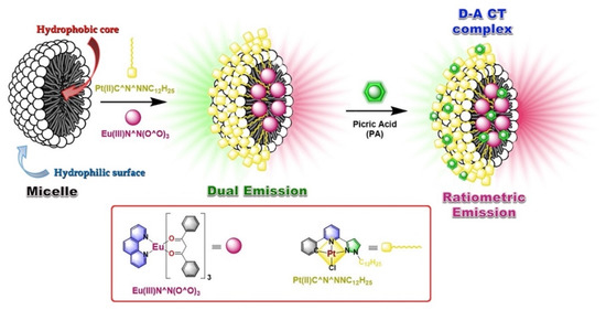 The proposed model of ratiometric probe showing ratiometric sensing of PA at ambient condition in an aqueous medium. The model also depicts preferential entrapment of luminophores and analytes within the micelle adduct. Inset: The chemical structures of luminophores Eu(III)N^N(O^O)3 and Pt(II)C^N^NNC12H25.