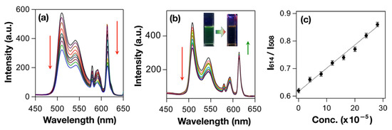 Sensing of target analytes by means of ratiometric luminescence probes is an effective technique compared to that of single luminophoric “Turn ON/OFF” molecular sensors. This is mainly due to the high sensitivity and reliability of a ratiometric probe which is reflected by their self-calibration resulted from two (or more) distinguished spectral signatures [86]. Likewise, ratiometric sensing of explosives by luminophoric micellar adducts could be realized by introducing two different luminophores in the same medium. The design strategy could be made by considering selective interactions of explosives with one of the luminophores while the other luminophore remains innocent towards analytes. Recently, Maity et al. successfully demonstrated a ratiometric luminescence probe for the detection of nitroaromatic explosives by employing two different luminescent metal complexes (viz. red luminescent Eu(III)-complex and green luminescent Pt(II)C^N^N-complex) in micellar host [87]. In a nonionic surfactant-based aqueous micellar structure (e.g., in TX100), both the luminophores were added simultaneously wherein the hydrophobic Eu(III)-complex occupies the hydrophobic micellar core, and partially ionic Pt(II)C^N^N-complexes remain attached on a micellar surface. The addition of PA to the micellar adduct resulted in significant quenching of Pt(II)C^N^N-based emission (at 508–545 nm) as a result of supramolecular D–A interactions with Pt(II)C^N^N-luminophore grafted on the surface. However, the red emission (614 nm) contributed by Eu(III)-complex remains slightly increased (Figure 18). In contrary, when the titration was performed against PA in CH2Cl2, quenching of both emission peaks was observed and hence confirms the very similar D–A supramolecular interactions between PA with both luminophores (Figure 19).