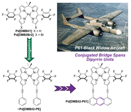 Conceptual strategy to target an extended palladium biladiene complex (Pd[DMBil2-P61]) possessing a conjugated bridge that spans both halves of the tetrapyrrole. This biladiene construct bears structural resemblance to the P-61 Black Widow aircraft.