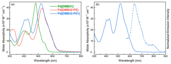 Steady-state spectroscopic properties of Pd[DMBil2-P61]. (a) Comparison of the UV-vis absorbance properties of Pd[DMBil1], Pd[DMBil2-PE], and Pd[DMBil2-P61] in MeOH. (b) UV-vis absorption spectrum (solid-trace) juxtaposed against the normalized luminescence profile recorded for Pd[DMBil2-P61] in toluene under N2.