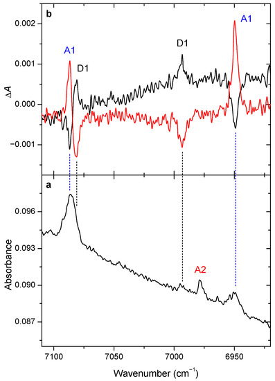 (a) Near-IR spectrum of the 2-F-4-OH benzoic acid in the 7110–6920 cm−1 range after deposition; (b) difference spectrum after laser irradiating the matrix at 6952.0 cm−1 (black trace) and at 6994.9 cm−1 (red), respectively.