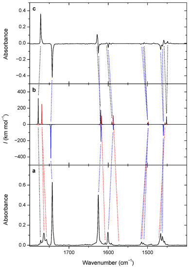 (a) Mid-IR spectrum of the 2-F-4-OH benzoic acid in the 1800–1400 cm−1 range after deposition; (b) simulated spectrum of conformers A1 (blue negative trace), A2 (red), and D1 (black) based on the anharmonic computations; (c) difference spectrum obtained by subtracting the spectrum taken after deposition from the one collected after ‘locally’ exciting A1 at 6952.0 cm−1.