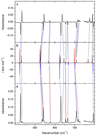 The quantum chemical geometry optimizations, as well as the harmonic and anharmonic frequency computations, were carried out in Gaussian 09 (Rev. D01) with Becke’s three-parameter hybrid functional B3LYP, using the non-local and local exchange correlation functionals as described by Lee–Yang–Parr and Vosko–Wilk–Nusair III, respectively [32,33,34,35]. Dunning’s correlation-consistent cc-pVTZ basis set was used [36]. The anharmonic frequencies were used to simulate the vibrational spectra by convoluting them with Lorentzian functions with an FWHM of 0.5 cm−1 in the Synspec software [37]. The isomerization barriers were estimated from the optimized transition states (TSs) using the Berny algorithm, as implemented in Gaussian [38]. This was followed by the computation of intrinsic reaction paths (IRPs) in the Cartesian coordinates [39]. The tunneling rates were estimated using the Wentzel–Kramers–Brillouin (WKB) model described in detail elsewhere [40].