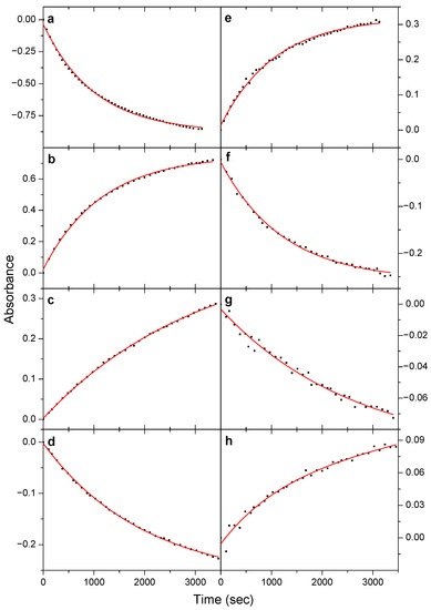 Kinetic curves of the 1742.5 cm−1 (a–d) and 1628.2 cm−1 (e–h) bands upon near-IR irradiations of 6952.0 cm−1 (a,e), 6994.9 cm−1 (b,f), 7093.2 cm−1 (c,g), and 7077.1 cm−1 (d,h).