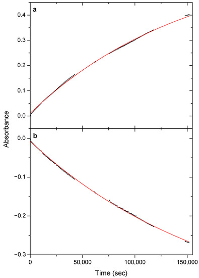 Figure 6 shows the kinetic growth/decay of conformers A1 and D1, respectively, when the already irradiated matrix was left in the dark overnight. To fit the experimental data, the same single exponential functions defined by equations E1 and E2 were used as in Section 3.3. The k values, as expected, are significantly (by roughly 2 orders of magnitude) lower than those obtained for the vibrationally induced processes and have a fair agreement with each other. The half-life of D1 was found to be around 115,000 ± 4000 s, which is some 32 h. It is interesting to note, however, that the second-order exponentials could also be fitted on these data providing a somewhat improved fit. The same holds true for the irradiation-induced processes, in most cases. This finding implies that there may be matrix sites with different vibrationally induced rotamerization and tunneling rates; thus, they can be classified as ‘slow’ and ‘fast’, which is a phenomenon that has been previously described [10,23,46].