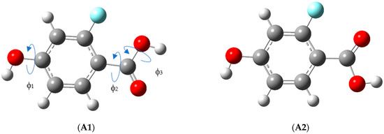 Structures of the eight conformers of 2-F-4-OH benzoic acid, namely A1, A2, B1, B2, C1, C2, D1, and D2 as denoted by the labels in bold and in parentheses below the structures. The three torsional angles φ1, φ2 and φ3 are defined in structure A1. In case of C2 and D2, only one of the two enantiomeric forms are depicted.