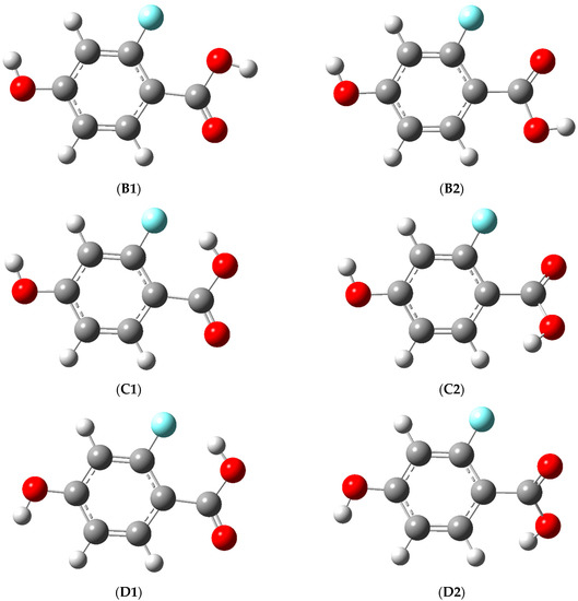 According to the orientation of the groups discussed above, the conformers have different stabilities. The most stable conformer is A1, which is closely followed by B1; the only difference between them is the alignment of the 4-OH group. Apart from this, they both have a trans-COOH carboxylic group (i.e., there is a weak intramolecular H bond between the H atom of the OH group with the C=O oxygen atom), whereas the O atom in the C=O group is on the opposite side with regard to the F atom. It should be noted that the energy difference is predicted to be 0.8 kJ mol−1, which is within the accuracy of the computational level. The next pair of conformers have slightly higher relative energies (by ca. 3 kJ mol−1) denoted with A2 and B2. They, similarly to A1 and B1, only differ from each other in the orientation of the 4-OH hydrogen atom as well, but, unlike A1 and B1, their C=O oxygen atoms are on the same side as the F atom. The next four conformers have cis-COOH groups, meaning inherently higher relative energies due to breakage of the abovementioned intramolecular H bond, which is counterbalanced to some extent in the case of the C1 and D1 by the formation of a less energetic H bond with the F atom. Their relative energy (with regard to the A1 form) is approximately 8 kJ mol−1; this value should more or less reflect on the difference of the H atom bond strength between the cases when the H atom creates the bond with the C=O oxygen and when it bonds with the F atom. Nevertheless, C1 and D1 only differ in the orientation of the 4-OH hydrogen atom, whereas their C=O oxygen atoms (similarly to A1 and B1) are on the opposite side of the molecule with regard to the F atom, thus allowing for H bonding between the carboxylic H atom and the F atom. Lastly, C2 and D2 are unique in the sense that, due to steric effects, their –COOH group is not in the same plane as the aromatic ring, which means that the φ2 torsional angle is closer to 30° instead of 0° and can be both positive and negative (i.e., the C=O oxygen atom and the carboxylic OH group are slightly above or below the plane of the aromatic ring). This results in the fact that both C2 and D2 are actually chiral and have two enantiomeric forms differentiated by an asterisk in Table 1 (i.e., C2, C2*, D2, D2*), and the only difference between C2 and D2 is the orientation of the 4-OH group. Apart from this, their C=O oxygen atoms, similarly to A2 and B2, is on the same side of the molecule with regard to the F atom and have cis-COOH groups (similarly to C1 and D1). As a matter of fact, this causes distortion of the molecule as the COOH hydrogen atom becomes relatively close to the H atom on the C atom in position six of the ring. Due to the unfavorable effects listed above, there is no intramolecular H bond in them, and therefore, they are much less stable than the other conformers; their relative energy lies more than 30 kJ mol−1 above the most stable A1 form. This also implies that their Boltzmann population at the sample inlet temperature (375 ± 2 K) is expected to be significantly less than 1%, which prohibits their IR detection in the deposited matrix.