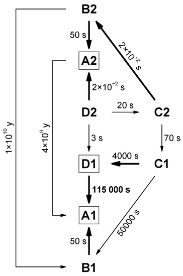 where P(E) is the probability of the tunneling process, m stands for the particle mass (1.68 × 10–27 kg for H), V0 is the barrier height, E is the particle energy (both in J), h is Planck’s constant, and w is the barrier width (in m). The tunneling rate k (in s–1) can be obtained by multiplying P(E) by the frequency of attempts (n, in s–1), which in the latter can be estimated using the anharmonic frequency of the vibrational mode that takes place in the process (ṽ, in m–1) by means of the formula ν = ṽc, where c is the speed of light (299,792,458 m s–1). The half-life t1/2 (in s–1) can be derived from k using the equation t1/2 = ln2/k. It is important to note that, due to the inherent uncertainty of the computational results, it is not extraordinary to have a difference of orders of magnitude between the computational and experimental values. What really matters is how the calculated values compare to each other, and this is why the theoretically obtained values can be scaled up with a uniform factor, so that they will be equal to their experimental counterparts [47]. Here, only the D1→A1 process that can be observed, so the theoretical value was multiplied by a scaling factor of 10,500, and the same was done for all of the other processes as well. Scheme 2 visualizes the tunneling rates of all possible processes, including the rotation of the 4-OH group, the OH group in the COOH moiety, and that of the whole COOH group.