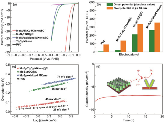 Currently, nanocarbons are encapsulated in MXenes-based systems, which can promote robust interfacial coupling with an improvement in separation and injection performance in favor of photogenerated charge carriers [69,70,71,72,73,74]. For instance, Qiu et al. have reported a carbon encapsulation approach for stabilizing 2D Ti3C2-MXenes and constructed a ranked MoS2/Ti3C2-MXenes with the association of a C heterojunction, thereby exhibiting exceptional HER efficiency with high structural stability [75]. MoS2/Ti3C2-MXene@C showed a low overpotential of 135 mV with 10 mA cm−2 in a 0.5 M H2SO4 solution, Figure 1a,b. The onset potential at −20 mV toward the HER was close to commercial Pt/C, and the Tafel slope was reduced to 45 mV dec−1 compared with bare Ti3C2-MXene, Figure 1c. Figure 1d shows the MoS2/Ti3C2-MXene@C exhibited a steady current density associated with a constant potential (130 mV) during a prolonged time of 20 h [76].