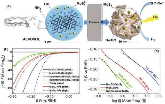 (a) Fabricated scheme for N-cGO/MoS2. (b) Polarized images during dark and light illumination. (c) Tafel curves. Reproduced with permission from Ref. [90]. American Chemical Society, 2015.