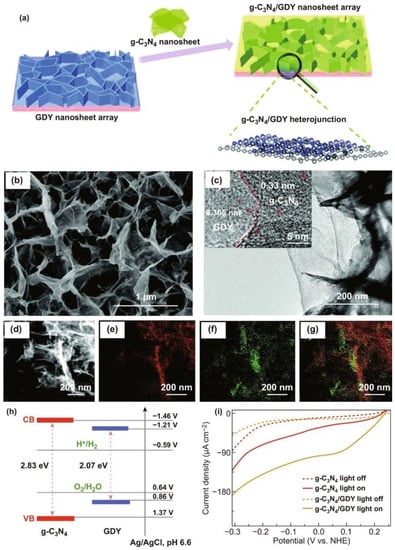 Lu et al. [108] fabricated a g-C3N4/GDY heterojunction as an exceptional photocathode for PEC-HER, Figure 3a. The stability of the g-C3N4/GDY heterojunction unified with an ultrathin layered construction (Figure 3b), and a highly charged carrier movement with a high surface has been suggested as being valuable for efficient transformation belonging to photo-induced charge carriers, thereby suppressing the reformation of photogenerated electrons and holes, and significantly revealing various active sites. This may present a greater interfacial contact lying among g-C3N4 and GDY, thereby providing short length channels available for transfer of the photo-induced electron-hole pairs. The layered g-C3N4 associated with the interfacial contact of GDY has been additionally proved through following EDX elemental mapping, Figure 3d–g. Meanwhile, remarkable band alignments owing to g-C3N4 and GDY (Figure 3h), show that photo-induced positive charges emerging from the g-C3N4 may speedily move toward GDY. Consequently, photogenerated charge carriers are effectively isolated caused by an externally applied electric field. In the same dynamics, the g-C3N4/GDY hybrid was revealed in the form of a seven-graded increment for electron tenure as 610 μs, whereas a three-graded increment was revealed with a photocurrent density of −98 μA cm−2 with 0 V vs. NHE, as compared to pure g-C3N4 of 88 μs and −32 μA cm−2 into a 0.1 Molar Na2SO4 solution, Figure 3i, that in turn revealed a g-C3N4/GDY photoanode displaying an attractive efficiency in favor of PEC-HER.