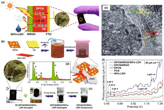 Hou et al. have progressed a N-deficient porous nature C3N4/N-doped graphene/NiFe-LDHs (DPCN/NG/NiFe-LDHs) aerogel photoanode, employing a superficial hydrothermal approach toward highly efficient PEC-OER, Figure 4a–e [56]. In a hybrid system, 3D NG has functioned in the form of an electron mediator toward shuttling photogenerated electrons and holes lying among N-deficient C3N4 and NiFe-LDHs, thereby leading toward enhanced separation along with transferring effectiveness for photogenerated carriers. Moreover, a DPCN/NG/NiFe-LDHs photoanode exhibited optimal configuration in favor of PEC-OER through having a uniting beneficial relevance with every component inheriting the properties for 3D aerogels. Further, the photocurrent-density owing to the DPCN/NG/NiFe-LDHs moved to 72.9 μA cm−2 with 1.22 V against a RHE of OER irradiated with AM 1.5G, Figure 4f, and an IPCE of 2.5% at 350 nm.