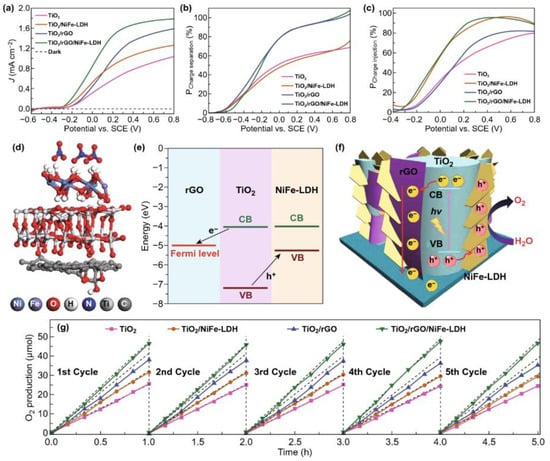 Depending upon the optimal PEC configurations, efficient nanocarbons/LDHs systems also have displayed as energetic components that have been used supplementarily for integrating with alternative semiconductors (TiO2, BiVO4, and Cu2O) to construct high-performing three-component photoanodes [134,135,136,137,138,139,140,141]. For instance, Ning et al. presented a more suitable approach for constructing a hybridized PEC system to introduce RGO and NiFe-LDHs over TiO2 nanorod arrays (NAs). Moreover, this approach not only developed a separation with the transportation belonging to photogenerated electrons and holes but also enhanced the PEC-OER performance, Figure 5e,f [142]. Initially, TiO2-NAs were steeply grown over a FTO substrate by employing a tailored hydrothermal strategy, and layered RGO was deposited on TiO2-NAs. Further, layered NiFe-LDH is consistently electrodeposited over TiO2/RGO NAs for fabricating TiO2/RGO/NiFe-LDH photoanodes. Moreover, the collective experimental and computational studies have revealed that with the addition of RGO, they become strongly capable of collecting the photogenerated electrons extracted from TiO2 because of a large work function associated with high electron mobility, Figure 5d. This electron mobility is improved, and in turn ensures the NiFe-LDH functions effectively for OER electrocatalysts. The hybrid photoanode has offered a significant improvement in the photocurrent density of 1.74 mA cm−2 with 0.6 V and photoconversion activity of 0.58% with 0.13 V, which is considered superior as compared with TiO2-based photoanodes due to a synergistic effect Figure 5a. Further, it has been evaluated in support of a charge carrier separation performance of 98% with 0.6 V over TiO2/RGO/NiFe-LDH NAs, which have been significantly improved at 66% with 0.6 V over pure TiO2 NAs. Meanwhile, the charge addition performance has been improved in favor of TiO2/RGO/NiFe-LDH, obtaining 95% along with 76% for simple TiO2-NAs, respectively, which infers a high efficiency toward PEC-OER activity. Additionally, a ternary hybrid photoanode has been exploited on an average basis for O2 evolution yielding 15.5 mmol h−1 cm−2 attached with a Faradaic capability of 97%, Figure 5g, which has been determined to be 1.88 times greater as compared with the TiO2-NAs. These results have proved to introduce RGO and NiFe-LDH, revealing an apparent enhancement of the PEC-OER efficiency with a remarkable stability when irradiated with sunlight. The photo-induced electrons moved toward a RGO extraction of CB for TiO2 with holes toward the NiFe-LDH extraction of valence band owing to the TiO2.