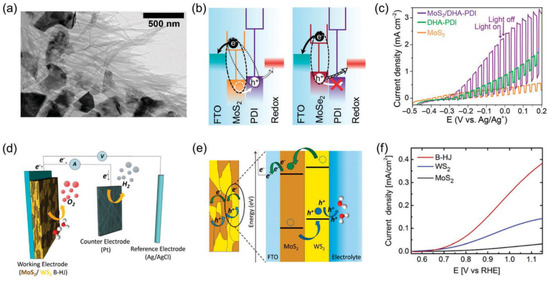 For the improvement regarding PEC efficiency for photoelectrodes and to construct a multicomponent 2D-layered bulky heterojunction (BHJ) nature, photoelectrodes have also been reasonably examined [145,146,147]. A hexanoic acid and functionalized perylene-diimide (DHA-PDI) derived composite has been offered for the formation of a hybridized ultrathin-film type photoelectrode associated with a MoS2 atomically layered-nature, thereby leading to the form of a valuable type-II band configuration [146]. A TEM indicated the MoS2/DHA-PDI hybridized bilayer thin film, Figure 6a. The creation corresponding to an interfacial dipole over a MoS2-organic interfacial contact has been significantly exhibited. It has also been proposed that type-II band alignment existing among the MoS2 inorganic layered nature and organic DHA-PDI led toward an efficient charge isolation and an improvement in light absorption, Figure 6b.