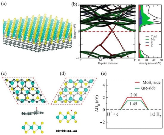 (a) Bi-layered heterostructure. (b) Relevant band structure and density of states. Hydrogen (red sphere) adsorption toward (c) graphene orientation and (d) MoS2. (e) Curve for ΔGH denoting hydrogen adsorption for both mentioned cases. Reproduced with permission from Ref. [156]. American Chemical Society, 2017.