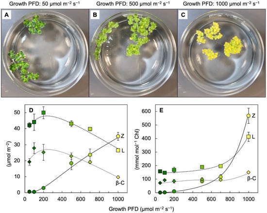 (A–C) Images of crystallizing dishes with Lemna gibba fronds grown under 3 different PFDs. Relationship between growth PFD and the levels of zeaxanthin (Z), lutein (L), and β-carotene (β-C) on a frond area basis (D) or a chlorophyll basis (E). Colors of the symbols from dark green to yellow correspond to the different visual appearances of fronds grown under the different growth PFDs. Data re-graphed from [33].