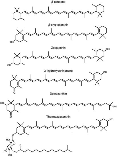 Zeaxanthin is also accumulated by non-photosynthetic bacteria, some of which are named after this feature (Mesoflavibacter zeaxanthinifaciens, Zeaxanthinibacter enoshimensis, Paracoccus zeaxanthinifaciens; [47,48]). A notable case of an extremophile is the bacterium Deinococcus radiodurans, isolated from a radioactive site in Japan and described as a “gold medalist” for the tolerance of ionizing radiation [49]. Deinococcus radiodurans accumulate deinoxanthin and zeaxanthin [50,51,52,53]. Ionizing radiation produces vast amounts of ROS (e.g., hydroxyl radical and superoxide) via water hydrolysis [54]. A zeaxanthin glycoside ester, thermozeaxanthin, is accumulated in non-photosynthetic microorganisms, including members of the bacterial genera Halococcus, Halobacterium, and Thermus [55,56] as well as the Archean Haloarcula japonica [57], which all exhibit robust resistance to salinity and/or extreme heat. These findings further support the role of xanthophylls, with features such as those shown in Figure 4, in supporting life in extreme environments.