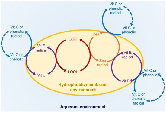 Schematic depiction of the multiple intertwined oxidation and reduction cycles supported by various possible interactions of membrane-soluble and water-soluble antioxidants. Vit C = ascorbate; Vit E = tocopherol; LOO* = lipid peroxyl radical; LOOH = lipid; Zea = zeaxanthin After [96].