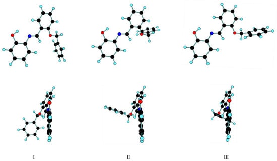 The BBAP molecule possesses six internal degrees of conformational freedom, besides cis and trans isomerism around the C=N azomethine bond. However, all the low-energy conformers of the synthesized trans C=N isomer (E isomer) have the geometry of the phenolic moiety determined by the stabilizing intramolecular O–H···N hydrogen bond established between the phenolic O–H group (as H-donor) and the azomethine nitrogen atom (as acceptor), as it is characteristic for ortho OH-substituted aryl Schiff bases [,,,,], which was pointed out in the introduction. The calculations for different arrangements around the C–O(H) and C–N bonds led to conformers whose energies are 28–51 kJ mol−1 higher than that of the most stable conformer (see Table S1 and Figure S4) and are irrelevant in practical terms. In this way, the number of significant conformational degrees of freedom was reduced to four, which correspond to the internal rotations around the two exocyclic C–C bonds and the two ether C–O bonds (see Scheme 1). A systematic search on the potential energy surface of the molecule considering these four internal rotations as scanning coordinates allowed us to identify 11 different conformers (all having an equivalent-by-symmetry form), of which three are low-energy forms, with relative energies within ca. 4 kJ mol−1, and the remaining have energies higher than that of the most stable conformer, by 13–29 kJ mol−1 (Table 1).