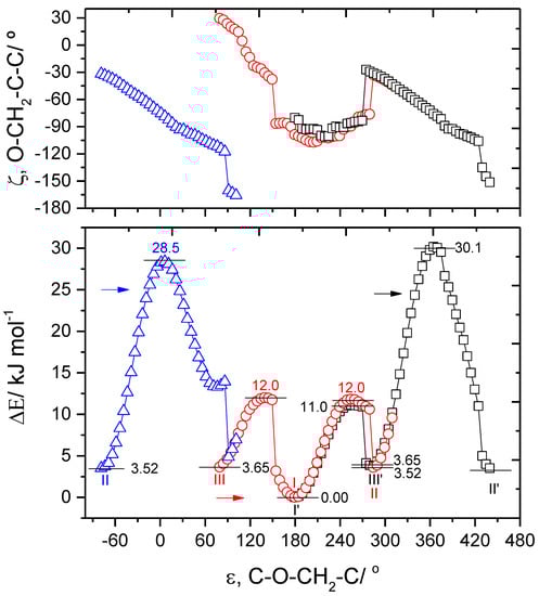 Potential energy profiles for interconversion between conformers I, II and III (and their symmetry-related forms I’, II’ and III’), obtained by performing relaxed scans (shown in different colors) with the C–O–CH2–C (ε) dihedral angle as scanning coordinates. The initial geometries chosen for the scans and the direction of the scans are indicated by the arrows.